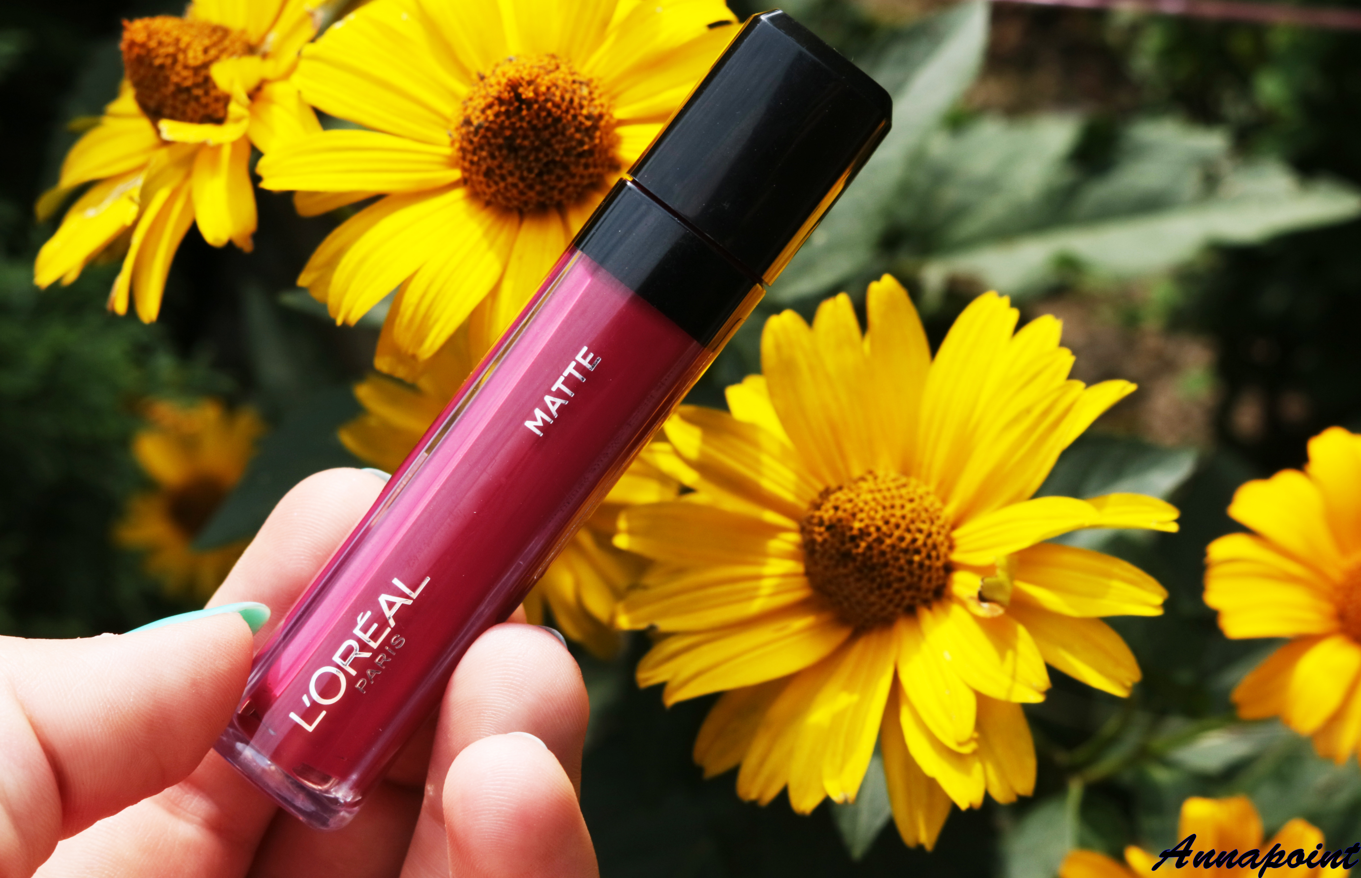 Razem z bazą otrzymałam matową pomadkę marki L`oreal w odcieniu 407. Pomadka ma bardzo ładny głęboki odcień, który super sprawdzi się jesienią. Nie mogłam się doczekać i nałożyłam pomadkę na usta. Pomadka ma matowe wykończenie, ale nie zastyga do końca. Pomadka na ustach pozostawia pudrowe wykończenie, które odbija się na szklance, czy dłoni. Możecie nadmiar pudrowości ściągnąć za pomocą chusteczki. Ten trik spowoduje, że pomadka będzie odbijać się mniej, ale wtedy i pigment pomadki jest mniejszy.